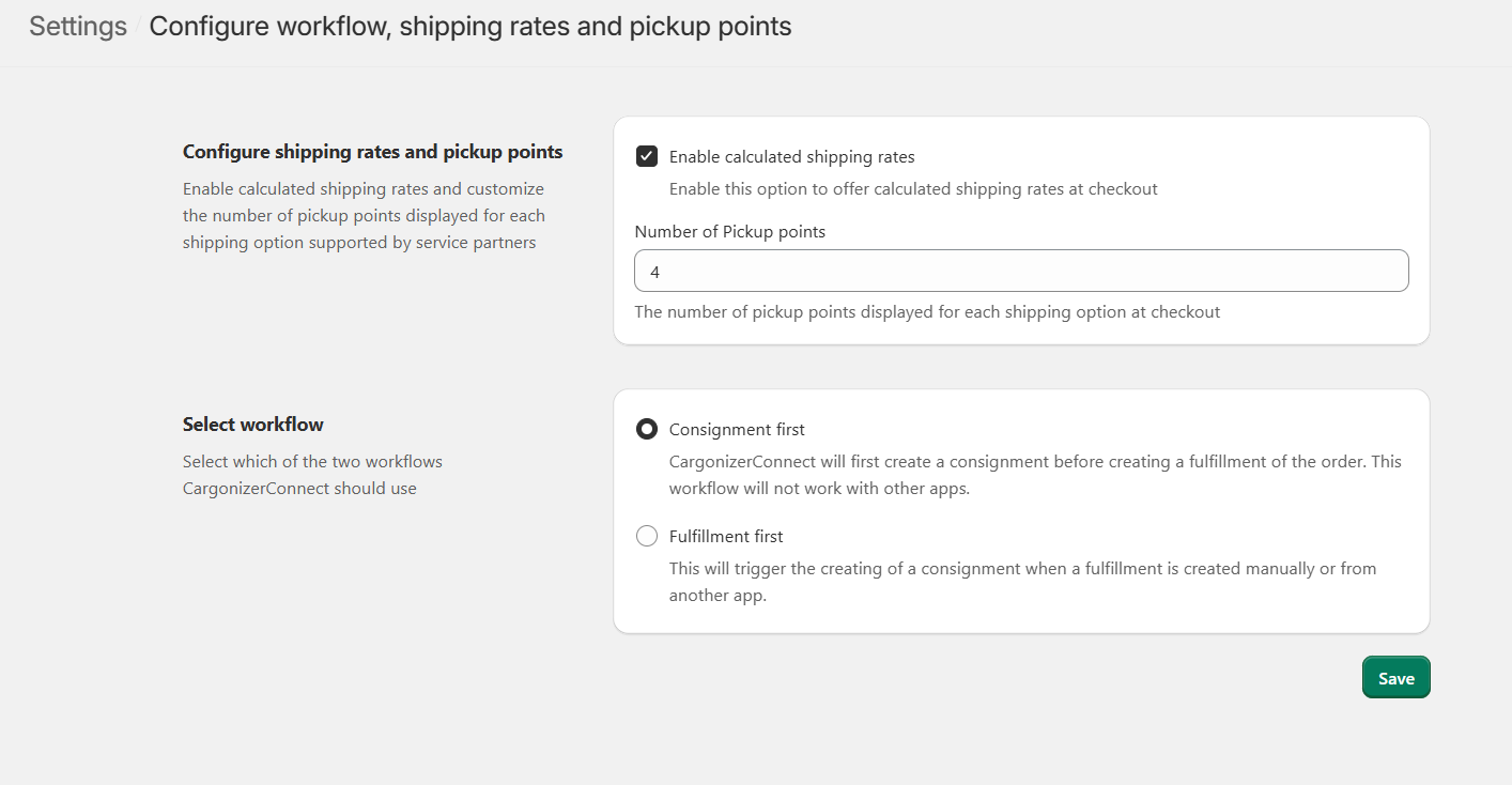 - Klikk på apper -> velg "Cargonizer Connect" -> Settings & Configuration -> Configure workflow, shipping rates and pickup points og klikke på "enable"