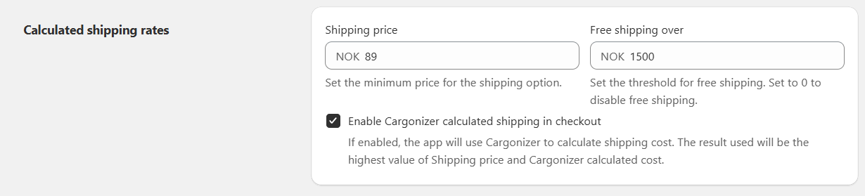 Hvis aktivert, vil appen bruke Cargonizer til å beregne fraktkostnaden. Resultatet som brukes vil være det høyeste beløpet mellom den angitte fraktprisen og den beregnede kostnaden fra Cargonizer.