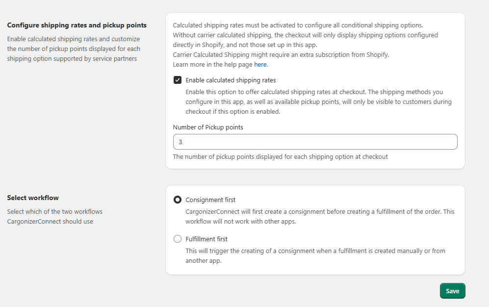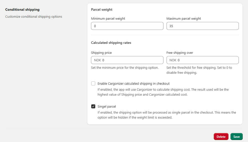 Hvis du aktiverer «Enable Cargonizer calculated shipping in checkout», vil appen bruke Cargonizer til å beregne fraktkostnadene.