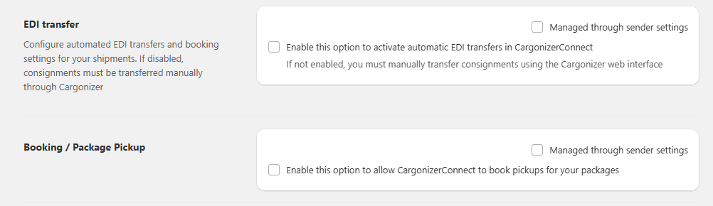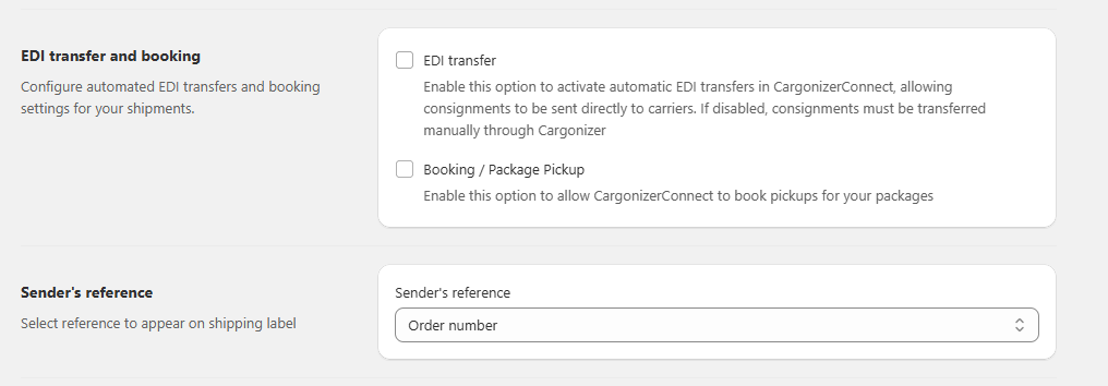 Aktiver dette for å la CargonizerConnect bestille opphenting av pakker, dersom transportøren støtter dette.7.7.2 Globale innstillinger fra avsenderinnstillinger