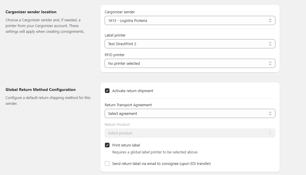 Velg hvilken avsender (lokasjon) som skal brukes fra Cargonizer-kontoen din. Denne avsenderen vil gjelde når forsendelser opprettes.4.2.2 Etikettprinter