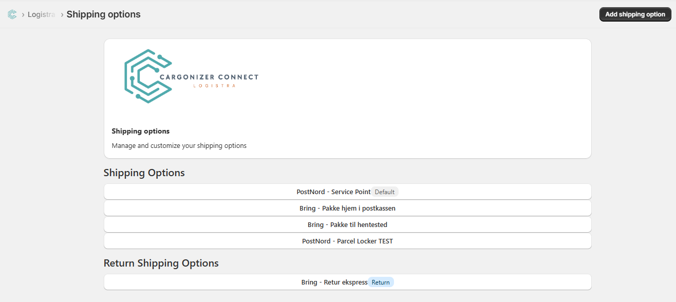 - 7.1.1 For å legge til et nytt fraktalternativ, klikk Legg til fraktalternativ eller rediger et eksisterende ved å klikke på fraktalternativet.