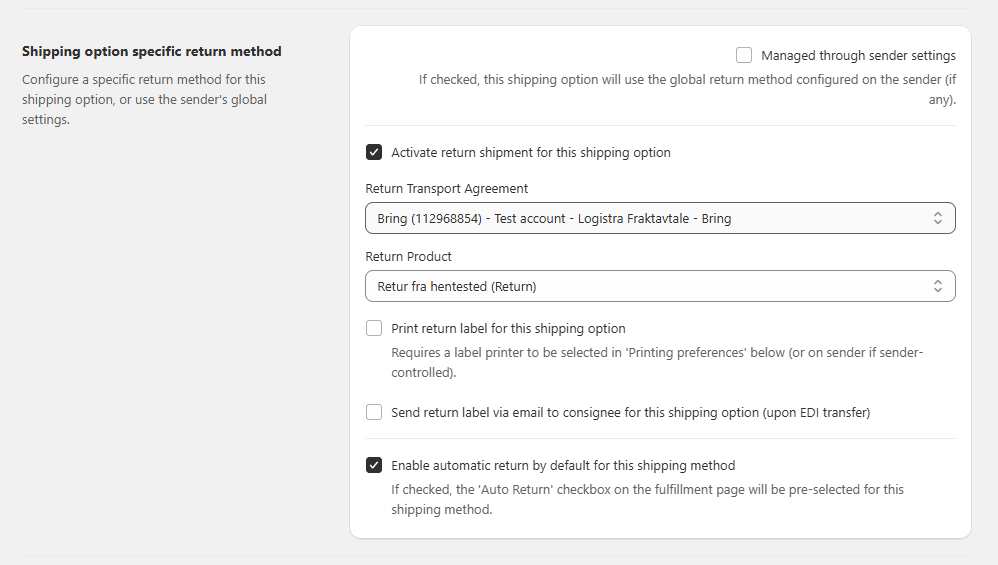 Hvis du velger «Managed through sender settings», vil fraktalternativet bruke de returinnstillingene som er definert på avsendernivå (se kapittel 4.3).7.3.2 Aktiver returfrakt for dette fraktalternativet