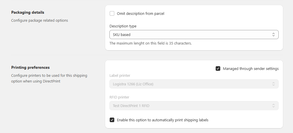 Hvis du velger «Managed through sender settings», brukes printerinnstillingene som er satt opp på avsendernivå.7.5.2 Etikettprinter / RFID-printer