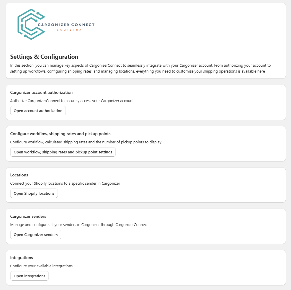 Når du åpner CargonizerConnect i Shopify, starter du i Settings & Configuration.