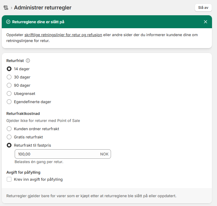 i Shopify-admin - Gå til Innstillinger → Retningslinjer → Returregler → Administrer