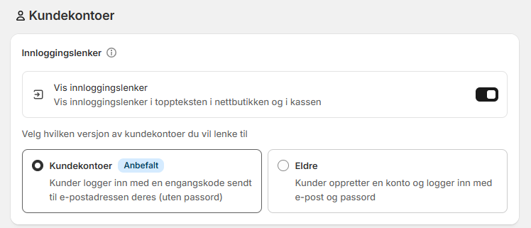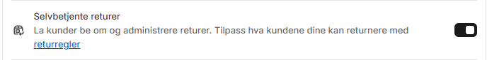 - i Shopify-admin - Gå til Innstillinger → Kundekontoer→ aktiver Selvbetjente returer