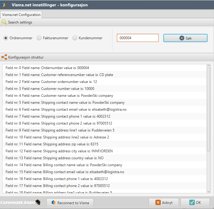 Hent enkelt navn og adresseinformasjon fra dine ordrer eller fakturaer i Visma.Net via Cargonizer Agent.